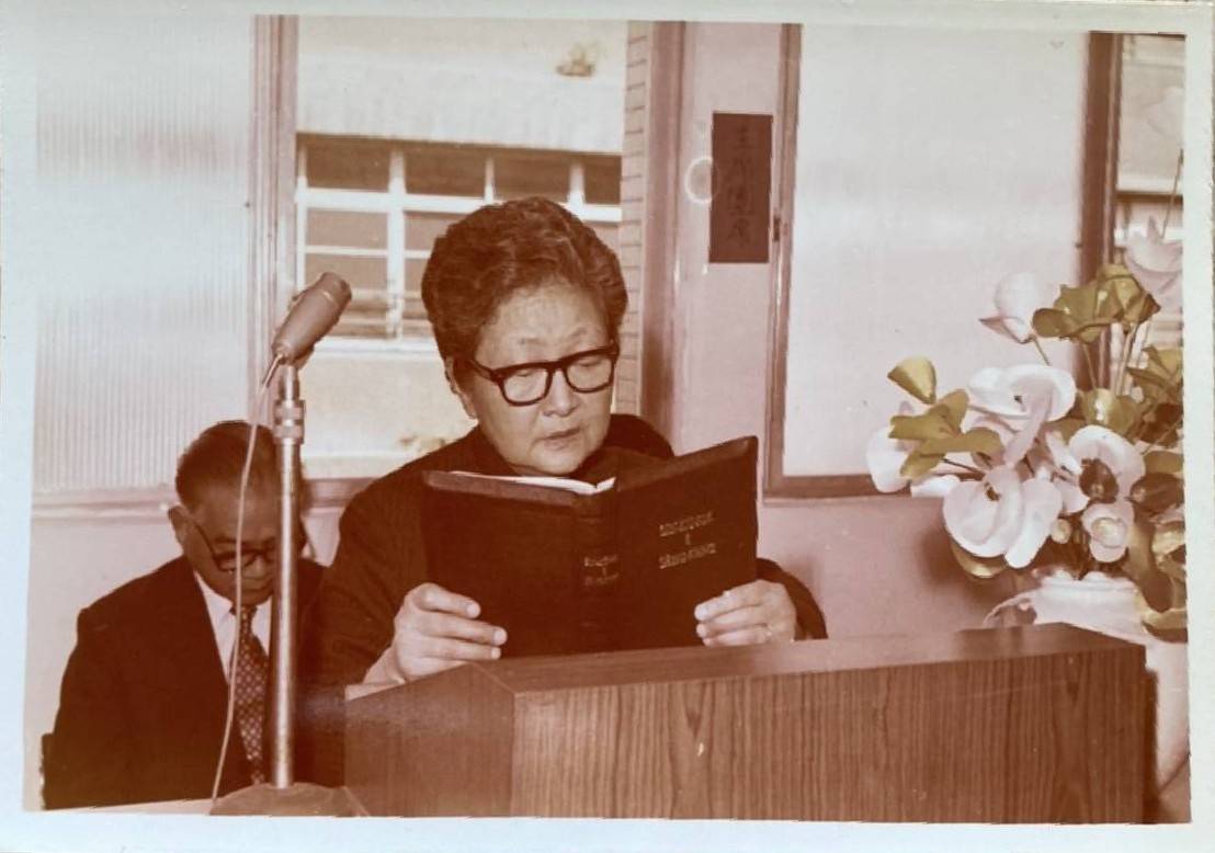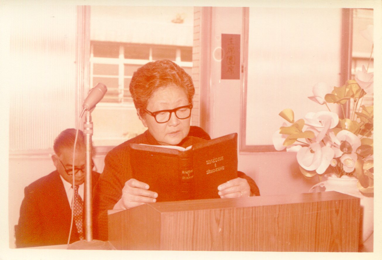 洪如碧提供(37)_1972.03.09_北部女宣大樓及臺灣婦女聖經書院新校舍落成典禮_奉獻禮拜中_馬洪宇英長老讀聖經